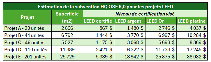 Estimation de la subvention HQ OSE 6.0 pour les projets LEED